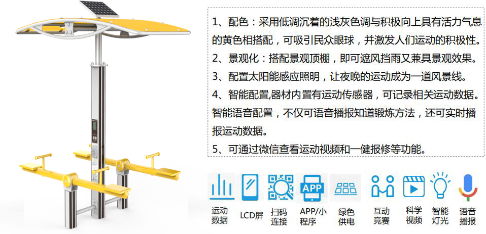 开元全民健身产品涵盖健身路径、运动场馆、篮乒气羽排等产品,分为多个系列,先进的制造工艺、严苛的质量检测,确保产品性能优良、品质安全可靠,让运动简单科学。并将全民健身器材(户外路径器材、体育场馆等产品)进行智能化升级和互联,实现全人群覆盖、全场景智能,让运动赞美生活。