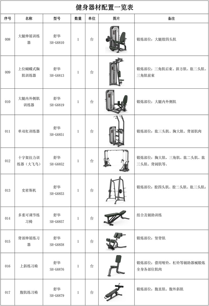 13.开元史密斯机SH-G6853*1台-锻炼股四头肌、股二头肌、肱三头肌;史密斯机采用固定轨迹的杠铃设计,大大降低了训练过程中的安全风险,通过深蹲、卧推、肩推等经典动作,可以针对性地锻炼腿部力量、上肢力量、背部肌群、胸部塑形以及肩部稳定等,从而全面提升身体素质,满足不同的健身需求;