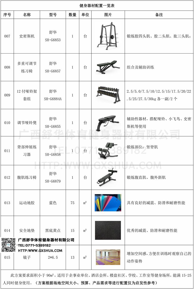 此方案要求面积小于90m²,适用于企事业单位、酒店会所、楼盘社区、学校、工作室等健身场所,能满15-25人同时健身使用。(方案根据场地空间大小、预算、产品需求等进行配置仅为启发性参考)