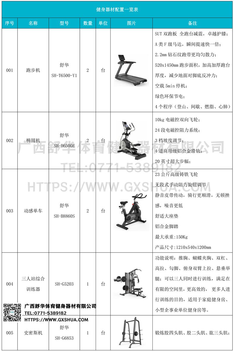 1.开元X5跑步机SH-T6500*2台-新X5拥有740mm的宽敞跑台,520mm宽跑带,跑步时更畅快无拘束。搭载SUT全跑台减震系统,针对跑步冲击区进行前、中、后以及双侧全方面避震,有效分散跑步时对跑者膝盖和踝关节的冲击,跑步也能更护膝。采用T18MM跑板+5MM减震棉+T12MM双层专利跑板减震结构设计的韧性跑板,承重力强,回弹舒适,带来缓震护足的舒适跑步体验。搭载了一颗持续马力2.5HP,峰值马力5.0HP的强劲动力马达,能为跑步提供源源不断的动力,让跑步流畅不卡顿。跑步机的速度可达18km/h,能够满足更专业的跑步锻炼需求。