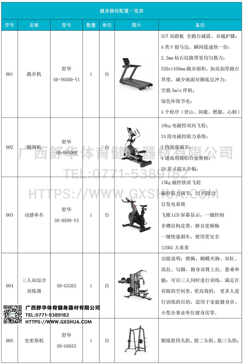 1.开元X5跑步机SH-T6500*2台-新X5拥有740mm的宽敞跑台,520mm宽跑带,跑步时更畅快无拘束。搭载SUT全跑台减震系统,针对跑步冲击区进行前、中、后以及双侧全方面避震,有效分散跑步时对跑者膝盖和踝关节的冲击,跑步也能更护膝。采用T18MM跑板+5MM减震棉+T12MM双层专利跑板减震结构设计的韧性跑板,承重力强,回弹舒适,带来缓震护足的舒适跑步体验。搭载了一颗持续马力2.5HP,峰值马力5.0HP的强劲动力马达,能为跑步提供源源不断的动力,让跑步流畅不卡顿。跑步机的速度可达18km/h,能够满足更专业的跑步锻炼需求。