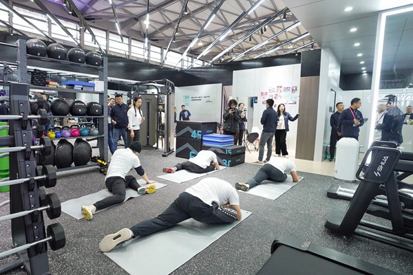 一进入开元展位,参观者如踏入真实的健身门店中,经过前台和洽谈区,进入体测区,可以了解自己的身体状况,为接下来的健身计划提供科学依据。根据用户需求的差异性,以“体能-体脂-体型”进阶为参照,开元健身会为用户规划出不同的课程类型,针对不同阶段的用户,匹配不同的授课内容及教练。展区还设有专业私教、特色团课以及设备体验区,参展观众可以在此亲身体验健身器材和优质健身课程,咨询健身教练,服务内容包含门店所有私教、小班课及器械使用指导,极具专业性和针对性。