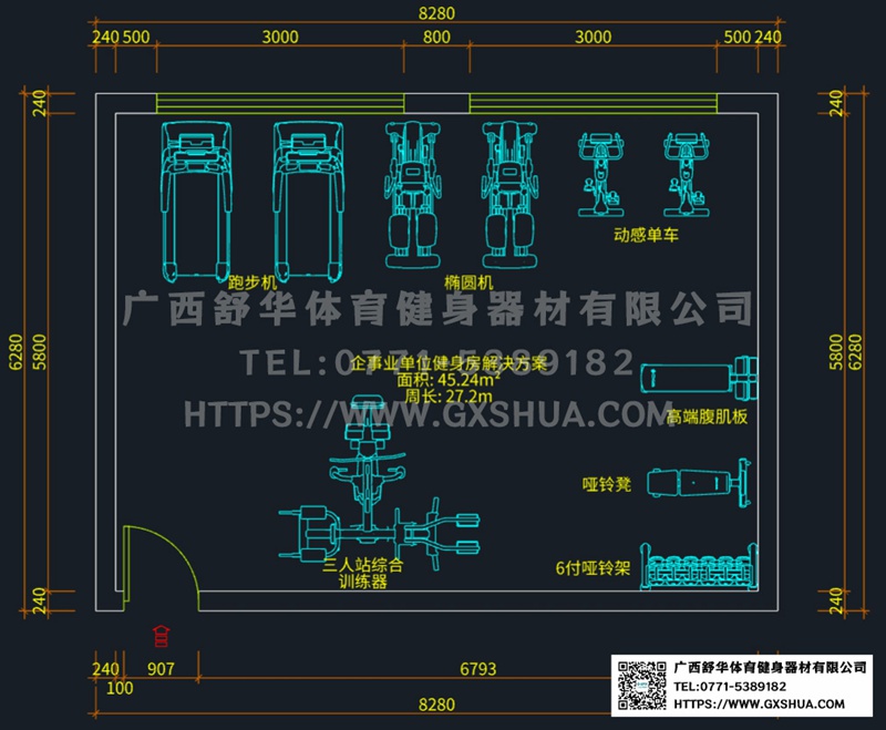 此方案要求面积小于46m²,适用于企事业单位、酒店会所、楼盘社区、工作室等健身场所,能满10-15人同时健身使用。(方案根据场地空间大小、预算、产品需求等进行配置仅为启发性参考)