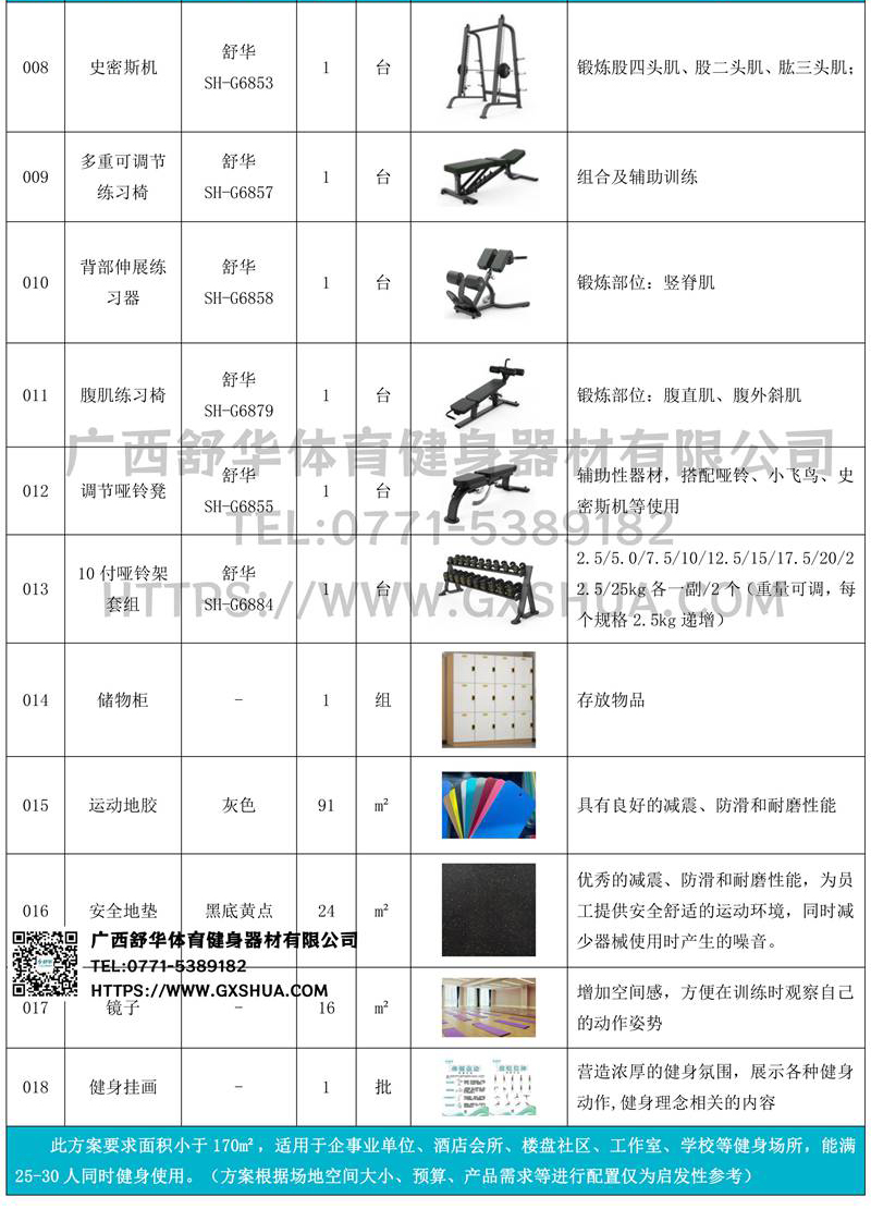 小飞鸟(1台)、史密斯机(1台)、多重可调节练习椅(1台)、罗马椅(1台)、腹肌板(1台)、10付哑铃套组(1套)、哑铃凳(1台),可以实现对不同肌肉群的针对性训练,满足肌肉训练需求,全方位激活身体机能。