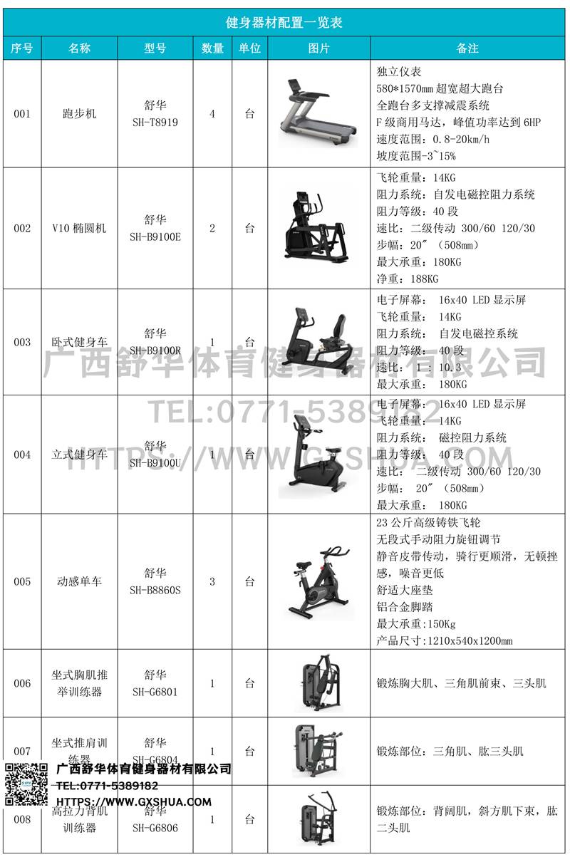 1.开元V9跑步机SH-T8919*4台-独立仪表-简洁大气,全新外观设计,健康运动新选择;心率监测功能,可通过手握心率、无线心率带等不同方式实时采集心率数据;580*1570mm超宽超大跑台-跑感舒适,跑台整体安全稳定;全跑台多支撑减震平台,保证跑台超强支撑力,达到180kg支撑,满足专业健身房需求。F级商用马达-超强马达,AC 3.0HP 交流,峰值功率达到6HP,F级商用品质。速度范围达到0.8-20km/h;V9跑步机可实现跑台扬升功能,坡度范围-3~15%,满足客户不同的锻炼需求。